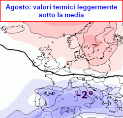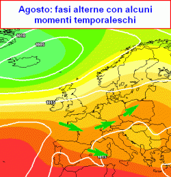 Per AGOSTO la corrente tenderebbe a frenare, favorendo però intrusioni di masse d’aria fresche ed instabili anche più a sud ed esaltando così l’instabilità atmosferica.