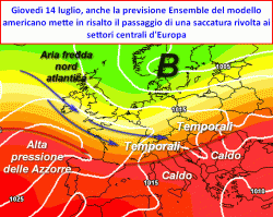 L’arrivo della prossima settimana coinciderà anche con un altro evento molto importante, inquadrato già da diverso tempo dalla previsione deterministica del modello americano; trattasi di una figura vistosa di bassa pressione, una vera e propria saccatura ricolma d’aria fredda nord-atlantica che avanzerebbe a piccoli passi verso i settori centrali del nostro continente europeo. Mercoledì 13 luglio, parte delle regioni settentrionali del nostro Stivale potrebbero già essere abbordate dalla propaggine più orientale di questa circolazione che determinerebbe una accentuazione dell’instabilità sull’arco alpino e prealpino, in successiva progressione verso le pianure.