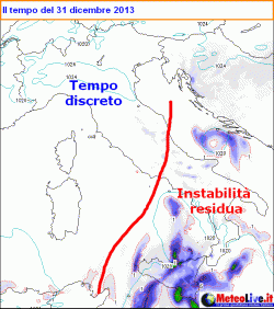 L’ultimo giorno del 2013 vedrà dunque condizioni di moderata instabilità al sud, con qualche ripercussione anche sul medio versante adriatico sino all’Abruzzo. Si tratterà di rovesci a carattere sparso, che si trasformeranno in neve sull’Appennino centrale fin verso i 1000-1200 metri e su quello meridionale tra 1300 e 1600 metri. I fenomeni tenderanno ad attenuarsi in serata, pur se rimarranno ancora probabili in maniera occasionale su Puglia e versanti ionici.