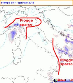 Eccoci ora al primo giorno del 2014: come detto una perturbazione atlantica si avvicinerà dalla Francia, preceduta da un flusso meridionale umido. Questo flusso porterà nel corso della giornata nuvolosità pesante e anche qualche pioggia sulla Liguria, in estensione a bassa Lombardia, Emilia e alta Toscana. Deboli nevicate sui rispettivi rilievi tra 800 e 1200 metri.
