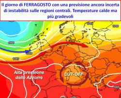 Ancora INCERTA la linea di tendenza riferita al giorno di Ferragosto, anche se la fase acuta di instabilità sarà già passata, dovrebbero rinnovarsi ancora le condizioni ideali allo sviluppo di temporali sui rilievi interni soprattutto del centro Italia. Il quadro più interessante riguarderà quello delle temperature che saranno più gradevoli e ventilate rispetto a quelle che stiamo registrando in questi giorni.