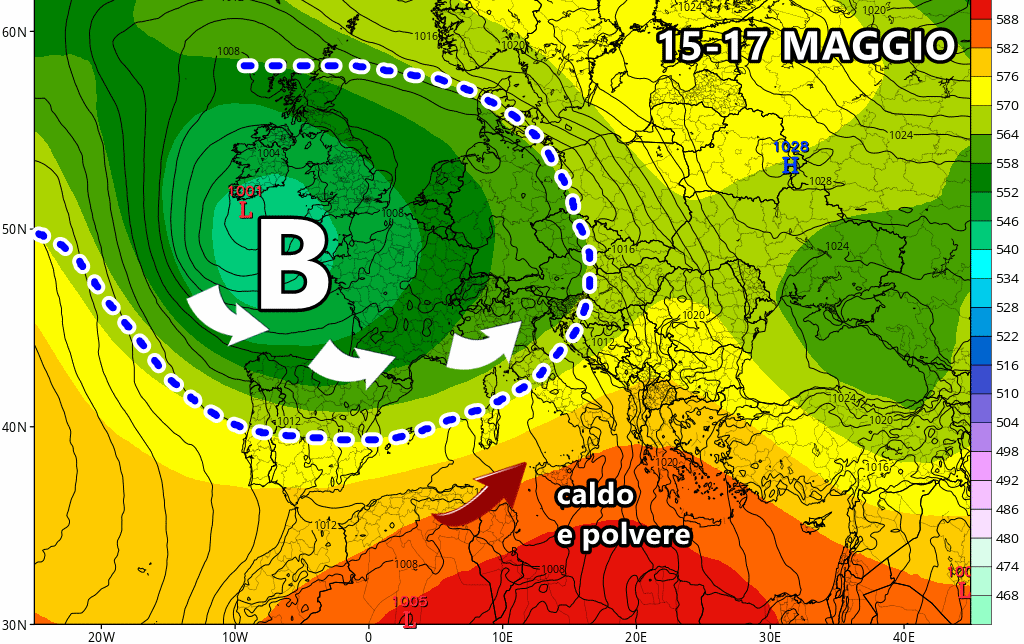 L’Italia si ritroverà letteralmente divisa in due, considerando che questi flussi freschi provenienti da ovest sferzeranno principalmente le regioni del Nord, laddove avremo a che fare con potenti contrasti termici. I flussi umidi di origine atlantica entreranno in convergenza con i venti molto più caldi, provenienti dai quadranti meridionali: da questo scontro di masse d’aria molto diverse tra di loro nasceranno tante nubi, piogge e forti temporali che potrebbero dar luogo anche a fenomeni molto intensi sul settentrione.