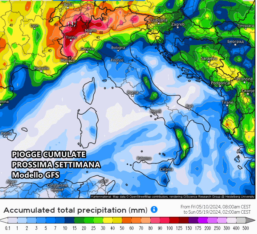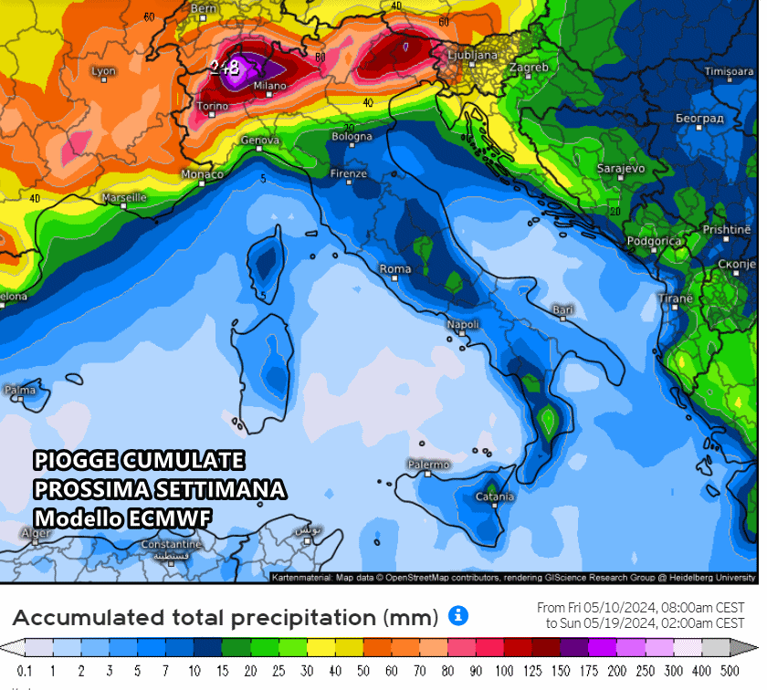 Anche il modello europeo ECMWF mostra un’Italia letteralmente divisa in due, con il nord alle prese con precipitazioni abbondanti per buona parte della settimana, mentre centro e sud resteranno ai margini delle precipitazioni più significative. Sia chiaro, isolati temporali saranno pur sempre possibili, soprattutto nelle aree interne lungo l’Appennino, ma con frequenza nettamente inferiore rispetto al Nord Italia.