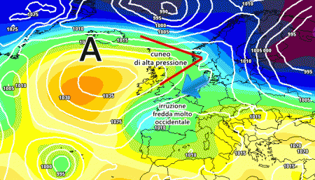 Ad inizio prossima settimana potrebbe verificarsi un primo assaggio delle fredde potenzialità invernali: il rinforzo dell’anticiclone in pieno Atlantico, a ridosso dell’Islanda, e la successiva espansione di un cuneo anticiclonico verso la Danimarca potrebbe innescare la discesa di un nucleo freddo artico verso l’Europa centrale e a seguire verso la penisola iberica e il Mediterraneo occidentale.