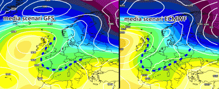 La media degli scenari (sia di GFS che di ECMWF), invece, mostra una previsione sicuramente più favorevole al maltempo in Italia, soprattutto al nord: in questo caso, infatti, l’irruzione fredda riuscirebbe a coinvolgere anche le nostre regioni settentrionali tra lunedì 22 e martedì 23. In tal caso le piogge sarebbero diffuse e localmente forti, mentre la neve scenderebbe a quote generalmente superiori ai 1000 metri, con brevi comparse dei fiocchi bianchi a quote inferiori sul Nordovest.