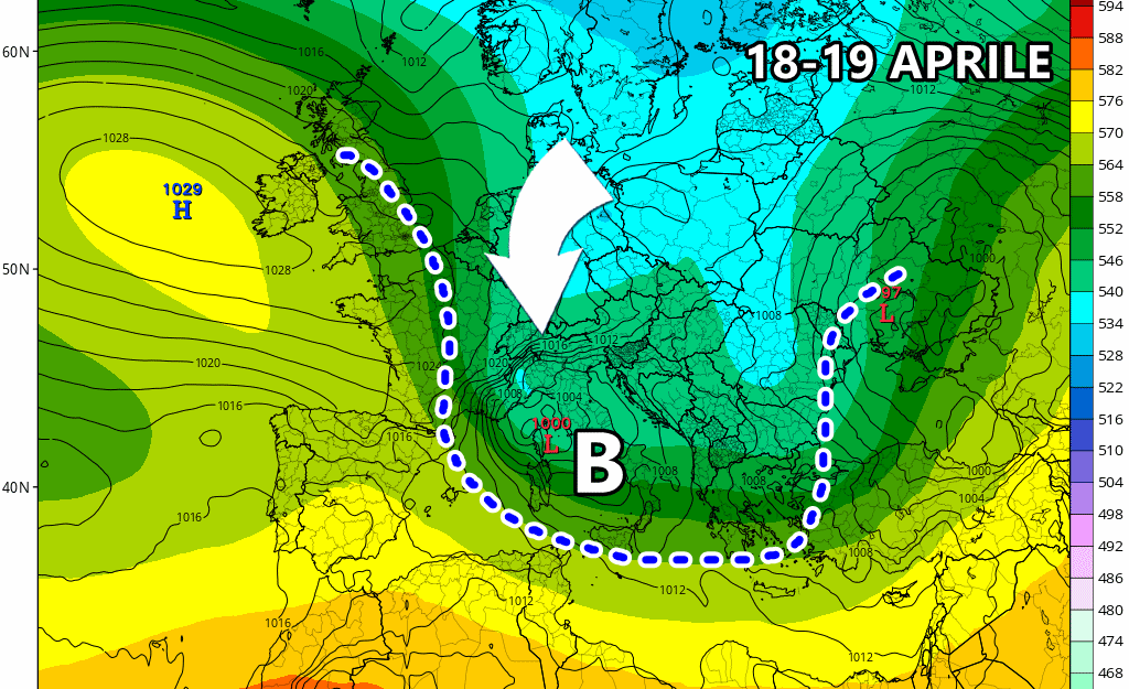 Il maltempo potrebbe addirittura intensificarsi attorno al 18 e al 19 Aprile grazie all’arrivo di un’altra depressione, questa volta sul Mar Tirreno, che rischia di arrecare piogge diffuse, locali forti temporali e soprattutto nevicate abbondanti in montagna. Considerando che questa depressione sarebbe alimentata dalle fredde correnti artiche, non escludiamo che la quota neve possa scendere a quote piuttosto basse per il periodo, soprattutto al nordest e sull’Appennino centro settentrionale. Nell’immagine sottostante possiamo chiaramente osservare l’emissione modellistica pomeridiana del modello americano GFS che mostra questa possibile depressione nel Tirreno alimentata dalle fredde correnti provenienti dal Nord Europa.