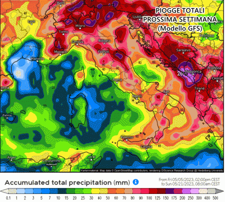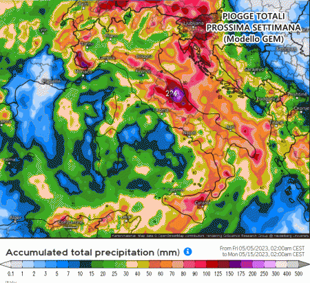 Anche il canadese GEM concorda con l’arrivo di tantissimo maltempo. Piogge diffuse su tutta Italia, ma gli accumuli più imponenti sono previsti al centro Italia, specie tra Abruzzo e Marche dove addirittura si prevedono punte di oltre 200 mm entro metà mese.