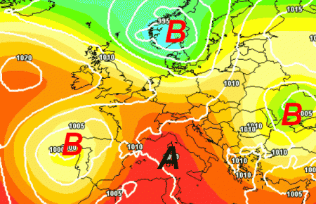 Si nota molto bene la rimonta dell’alta pressione africana scaturita dallo sprofondamento di una depressione in sede iberica. In altre parole, l’inizio della settimana prossima sarà contrassegnato dal sole e dal caldo che su alcune regioni potrebbe essere anche intenso. Pochi, se non nulli, i temporali sui rilievi nelle ore più calde.