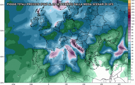 La prossima settimana, invece, potremmo vivere giornate pienamente autunnali per l’ingresso di masse d’aria nettamente più fresche e molto instabili dal nord Atlantico. Le possibilità di pioggia riguarderanno principalmente il nord ed il lato tirrenico, con accumuli totali superiori ai 100-150 mm entro il 29 settembre. Queste, al momento, le stime della media degli scenari di GFS (ovvero la previsione al momento più probabile del modello americano):