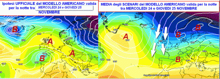Esaminiamo adesso il MODELLO AMERICANO: sulla sinistra lo scenario ufficiale, sulla destra la media di tutti gli scenari; il periodo preso come riferimento è sempre lo stesso, ovvero la notte tra mercoledi 24 e giovedi 25 novembre: