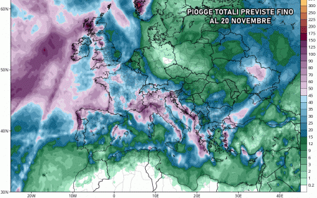 I principali modelli matematici (GFS e ECMWF) sono concordi sul ritorno delle piogge atlantiche a più riprese nella seconda decade, grossomodo tra 15 e 20 novembre. Eloquenti le precipitazioni totali previste dal modello inglese:
