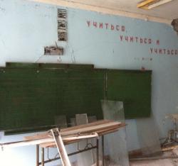 Guardando distrattamente la città dall’alto di uno dei tanti edifici abbandonati, la desolazione è evidente ma stupisce ancora di più se ti aggiri a piedi per i viali, partendo dalla famosa area del luna park, con la sua ruota panoramica, le macchinine arrugginite dell’autoscontro, la biglietteria, per raggiungere poi la piscina, rimasta stranamente attiva sino alla fine degli anni 90 e ad uso esclusivo del personale della centrale nucleare, la scuola con le lavagne sulle quali nessuno scriverà mai più nulla, gli orari delle lezioni e dei pasti, i libri ancora presenti alla