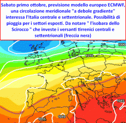 Uno sguardo alla previsione serale del modello europeo ECMWF; qualche pioggia per l'inizio di ottobre, poi l'anticiclone potrebbe chiudere nuovamente i battenti all'instabilità.