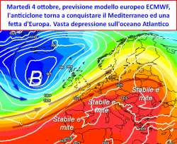 La linea di tendenza calcolata dal modello europeo nel periodo compreso tra il termine di settembre e la prima settimana di ottobre, mette ancora in risalto un quadro circolatorio che, a livello del Mediterraneo, continuerà ad essere influenzato dagli anticicloni. L’eccezione che conferma la regola nel tempo previsto i primissimi giorni di ottobre, momento in cui avremo a che fare con una vasta depressione arroccata all’oceano Atlantico ed ai settori occidentali europei, la quale potrà in parte coinvolgere anche il nostro Paese, portando al rinforzo di una circolazione di venti sud-orientali nei bassi strati e sud-occidentali in quota.