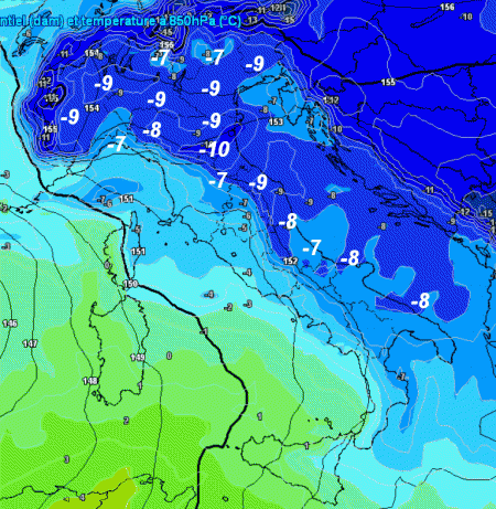 -10° a 1500 metri sono attesi sulla verticale dell’Emilia Romagna; tra -9° e -8° le temperature alla medesima quota sulla Valpadana e lungo tutto il versante adriatico comprese le aree interne del centro. Leggermente più stemperato il freddo sul Tirreno ed ancora di più sulle due Isole Maggiori.