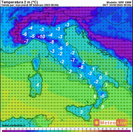 Notiamo un festival di segni negativi da nord a sud! Fino a -10° sull’Appennino settentrionale e -7/-8° su quello centro-meridionale. Valori diffusamente negativi anche in Valpadana con picchi di freddo fino a -6/-7° sul Piemonte. Più miti le Isole dove le temperature non dovrebbero andare al di sotto dello zero se non in quota.