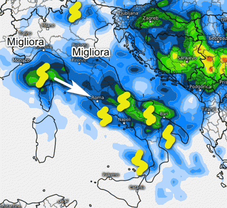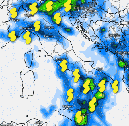 Sulla Sicilia e sulla Sardegna fenomeni poco probabili, mentre dal Lazio verso sud temporali anche forti specie nelle aree interne, ma con frequenti sconfinamenti costieri.