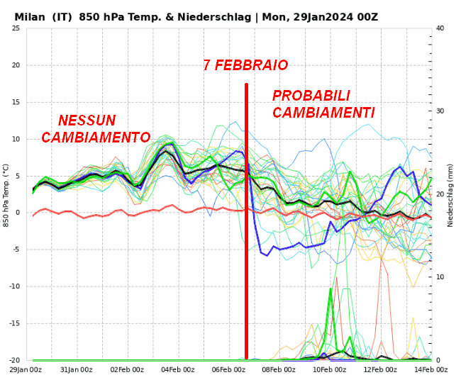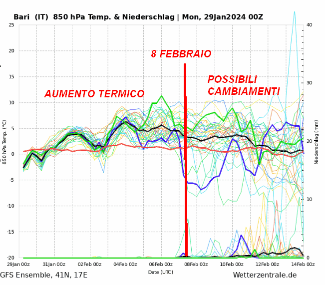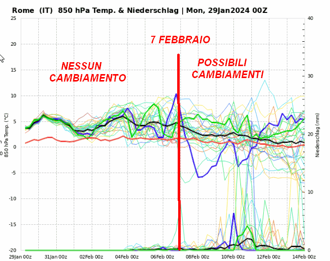 Dal diagramma si nota come sia praticamente INUTILE sperare in un cambiamento prima del giorno 7 febbraio. L’alta pressione sarà talmente forte che non concederà nemmeno un disturbo nel campo delle precipitazioni. Le speranze di cambiamento saranno possibili solo dopo il 7 di febbraio, ovvero a distanze temporali troppo elevate per stabilire le modalità con cui il tempo potrebbe cambiare.