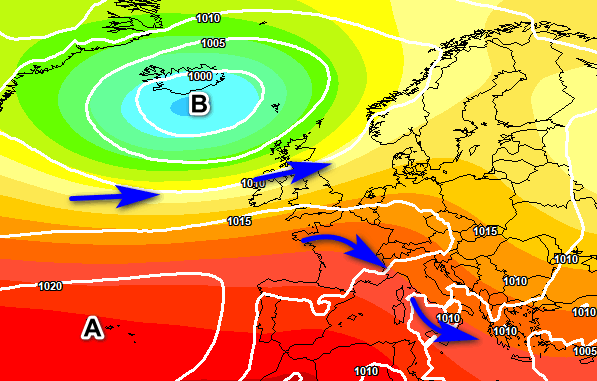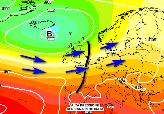 Il modello di oltre oceano è abbastanza ottimista e mostra l’abbassamento del flusso atlantico che tenderebbe a coinvolgere quantomeno il settentrione e parte delle regioni centrali, con un tempo maggiormente variabile/temporalesco e meno caldo. Notate l’alta pressione africana in ritirata verso sud e le correnti più fresche occidentali (frecce blu) che proveranno ad entrare al settentrione.