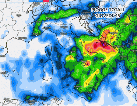 Venerdì le ultime piogge e acquazzoni interesseranno il sud e il basso Adriatico, ma con tendenza ad un lento miglioramento. Di seguito possiamo osservare gli accumuli di pioggia totali previsti fino a venerdì 16 Giugno, relativi al transito dell’intera perturbazione sull’Italia.