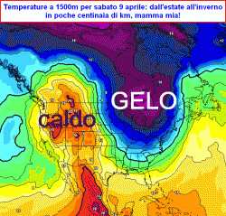e si osserveranno le stesse temperature a 1500 ma con valori positivi, dunque un gradiente termico orizzontale alla media quota di ben 40°C raccolti in poche centinaia di km.