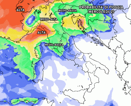 Dalle ultimissime emissioni modellistiche si evince un netto aumento delle nubi già da martedì sera su tutto il nord, ma le piogge arriveranno nel corso di mercoledì 21 su Liguria, Lombardia, Alpi occidentali di confine (Piemonte e Valle d’Aosta), gran parte del nordest e alta Toscana. Saranno piogge prevalentemente deboli e sparse. Da mercoledì sera rapido miglioramento a partire da ovest.
