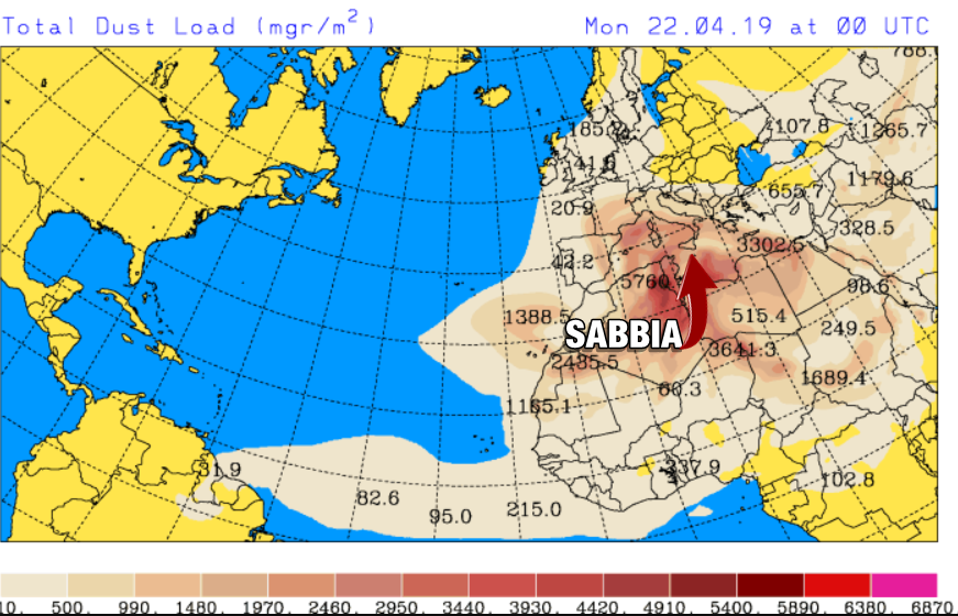 Il vortice ciclonico innescherà violente raffiche di ostro e scirocco dal nord Africa, le quali solleveranno ingenti quantità di pulviscolo del deserto destinate a dirigersi verso l’Italia. Vaste nubi di pulviscolo inizieranno a sorvolare il Mediterraneo già nella giornata di Pasqua, ma la loro presenza in cielo sarà ancor più netta nella giornata di Pasquetta, tanto da rendere i cieli lattiginosi. Dalla mappa si notano quantità piuttosto elevate di pulviscolo, previste per la notte di Pasquetta: specie al sud si prospettano concentrazioni tra i 1500 e i 2500 milligrammi di pulviscolo su metro quadrato (lungo tutta la colonna d’aria). Inoltre a causa dell’arrivo delle piogge, questa polvere desertica scenderà al suolo imbrattando ogni superficie.