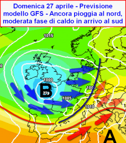 Confermato anche il secondo passaggio perturbato, quello relativo a domenica 27 aprile, caratterizzato da un impianto sinottico che veicolerebbe sull’Italia un attivo sistema perturbato che porterebbe conseguenze su gran parte del Paese. In primis le regioni settentrionali ma con effetti anche sulle regioni centrali e forse quelle meridionali. Questa previsione va quindi in parziale controtendenza rispetto a quanto previsto dal modello americano, maggiormente propenso ad una temporanea rimonta anticiclonica sugli estremi settori meridionali italiani.