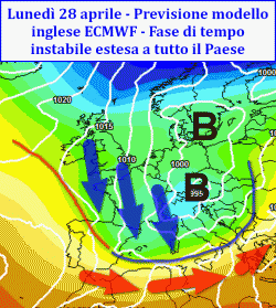Una seconda ben più intensa depressione sarebbe pronta ad attraversare il Paese nella giornata di lunedì 28 aprile, in questo caso sostenuta da un corposo calo di pressione e geopotenziale, precedente l’ingresso di un fronte freddo che prometterebbe alcune fasi di vero e proprio MALTEMPO soprattutto sui settori di nord-ovest, sulla Toscana e forse il Lazio. In questa sede sarà possibile una modesta rimonta d’aria calda al sud, come evidenziato sulla cartina.