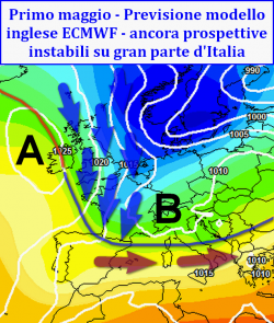 La linea di tendenza proposta dal prestigioso centro di calcolo con sede a Reading (UK) ricalca a grandi linee la previsione del modello americano, anche se sussistono delle differenze in merito al primo passaggio perturbato, quello previsto durante la Festività della Liberazione, caratterizzato da geopotenziali più bassi e quindi da una maggiore predisposizione dell’atmosfera a generare instabilità.