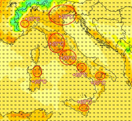 A cavallo tra martedì 23 e giovedì 25 febbraio il nuovo anticiclone raggiungerà una fase di massima forza sull’Europa centrale ed orientale, esso sarà accompagnato da un profilo delle temperature votato ad un netto rialzo. In particolare dagli ultimi aggiornamenti sembra proprio che l’alta pressione possa collocare i propri massimi non più sul’area balcanica come era stato preventivato inizialmente, bensì sulle regioni settentrionali italiane, dove nei prossimi giorni le condizioni di stabilità saranno pressochè assolute. L’elevato soleggiamento e la presenza di cieli pressochè sereni e sgomberi da nubi, favorirà un rialzo delle temperature soprattutto nei valori massimi. Tra mercoeldì e giovedì che saranno le giornate più tiepide, la colonnina di mercurio potrà più facilmente sfiorare la soglia dei +20°C sulle seguenti regioni: Piemonte, Lombardia, Emilia-romagna, Toscana, Umbria, Lazio. Ecco le temperature MASSIME preventivate dal modello americano GFS per mercoledì 24: