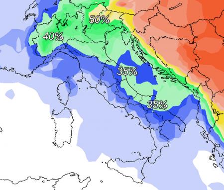 Ecco le probabilità calcolate dal modello americano di avere isoterme negative al piano isobarico di 850hpa (circa 1500 metri) per lunedì primo marzo: