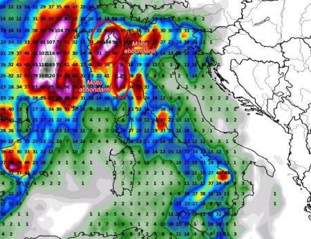 Accumuli totali della PIOGGIA prevista dal modello americano fino alle ore 15 di martedì:
