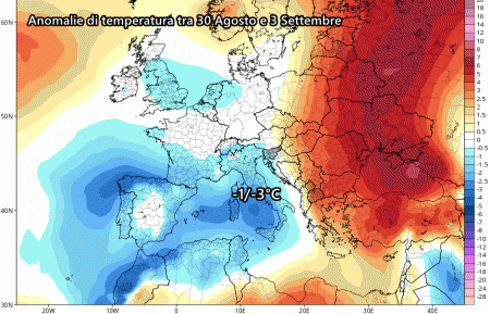 Esaminiamo ora le anomalie di temperatura previste nel corso dei prossimi 15 giorni nel Mediterraneo. Partendo dalla situazione attuale e dalle temperature previste fino al 3 settembre, si prevede che queste rimarranno al di sotto delle medie del periodo di circa 1-3°C su gran parte dello stivale.
