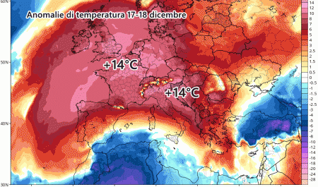 Davvero clamorose le anomalie previste tra domenica e l’inizio di settimana, praticamente su buona parte d’Europa. L’anticiclone porterà isoterme impressionanti, fino a +12/+13°C a 850hpa. Insomma le anomalie saranno notevoli, come si evince dalla mappa di previsione per domenica e lunedì. Si prospettano fino a 14°C oltre le tipiche del periodo su tutta l’Europa centrale e nord Italia.