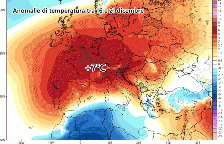 Notevoli anche le anomalie medie sull’arco di cinque giorni, tra 15 e 21 dicembre. Tutta l’Europa centrale vivrà un periodo prolungato di sopra media termico.