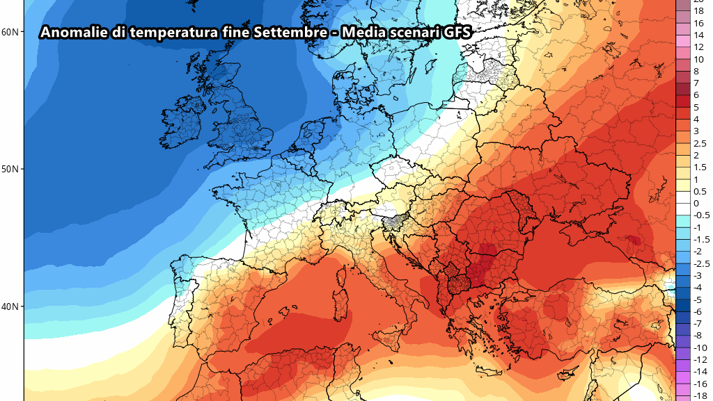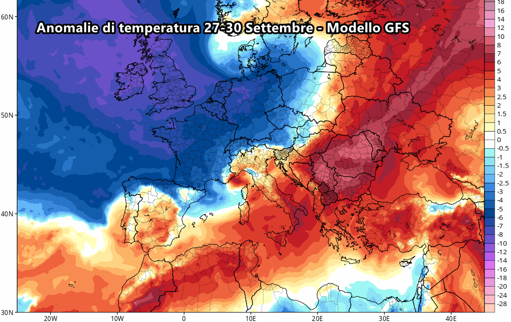 Ma quanto farà davvero caldo? Considerando che attualmente ci troviamo abbondantemente sotto le medie del periodo, è lecito aspettarsi un notevole incremento termico. Tra 27 e 30 Settembre si prevedono punte di quasi 5-6°C sopra le medie al sud, mentre man mano che ci si sposta verso nord si notano anomalie sempre più contenute.