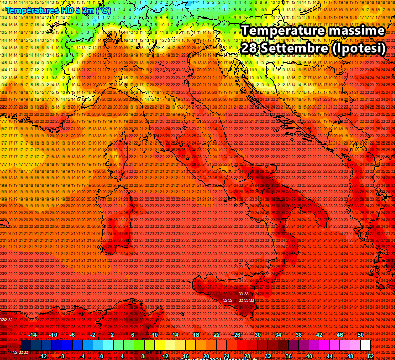 Nell’aggiornamento di venerdì alle ore 18:20 il modello ha aumentato lievemente le temperature fra Puglia e Basilicata, dove si raggiungeranno i 33°C semprte nella giornata del 28 settembre, invariate le temperature previste sul resto del sud.