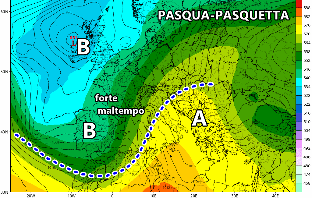 Dopo una piccola pausa tra il 28 e il 29 Marzo, è molto probabile l’arrivo di altre depressioni atlantiche sul Mediterraneo occidentale, le quali potrebbero essere responsabili di un nuovo severo peggioramento sul Nord Italia e altrove in corrispondenza di Pasqua e Pasquetta. Nel frattempo, il Sud Italia invece potrebbe vivere giornate un po’ più stabili e soprattutto molto più calde a causa del ritorno dell’Anticiclone nord africano richiamato proprio da queste depressioni atlantiche che scorreranno sul Mediterraneo occidentale.