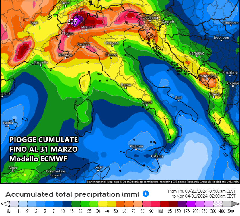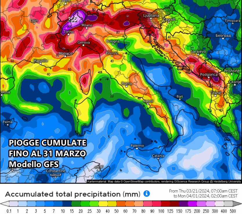 Decisamente eloquenti le precipitazioni cumulate previste nei prossimi 10 giorni, ovvero fino al giorno di Pasqua. Il modello americano GFS al momento propone i quantitativi più abbondanti al Nord sul lato tirrenico, come si può notare anche dai picchi oltre i 300 mm di pioggia previsti sull’Alto Piemonte.