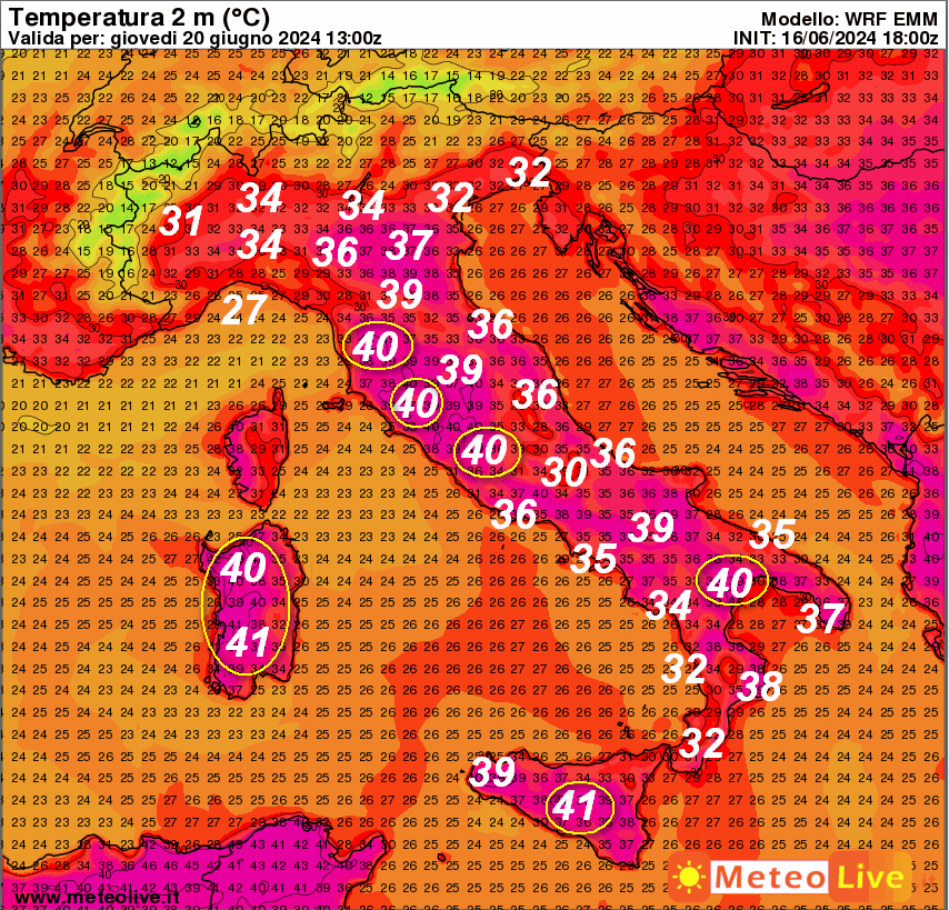 Vediamo subito le temperature attese al suolo in Italia alle ore 15 di giovedi 20 giugno.