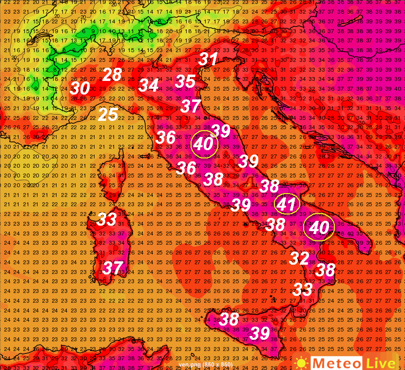 Una lieve flessione termica è attesa al nord dove potrebbero arrivare anche dei temporali. Sul resto d’Italia poche novità: punte di 40-41° saranno ancora possibili sulla Puglia e sulla Lucania, oltre alle aree interne dell’Italia centrale poste tra Umbria e Marche.