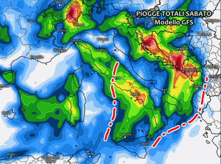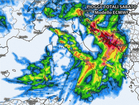 Di seguito le piogge totali previste sabato dal modello europeo ECMWF: