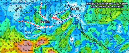 L’aria fredda affluirà al nord nel corso del pomeriggio di sabato, dando vita ad una serie di acquazzoni e temporali che andranno a coinvolgere in modo più diretto il nordest. Qui avremo lo scontro tra i venti secchi di foehn e il vento di bora che si intensificherà su tutto l’alto Adriatico: il contrasto solleciterà una grande instabilità dell’aria che sfocerà in annuvolamenti piuttosto pronunciati e ricchi di precipitazioni.