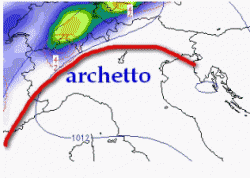 E’ il caso di tanti fronti che abbiamo osservato giungere sul settentrione negli ultimi 20 anni nelle mezze stagioni: la deformazione operata dall’arco alpino provocherà una dispersione dei fenomeni che disegneranno una sorta di archetto.