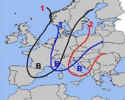 Se invece la discesa fredda si presenta più ad ovest del caso precedente, (numero 3 sulla carta) il tutto passa attraverso la Valle del Rodano. In questo modo si creano i presupposti per la formazione di una depressione sul Golfo Ligure, con una saccatura in quota che abbraccia tutto il Mediterraneo centro-occidentale con Bora scura e Tramontana scura al nord. In questo caso le condizioni di maltempo sono generalizzate e interessano in un primo tempo il centro-nord e in seguito anche il sud.