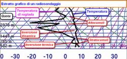 Più le due curve sono vicine, più l’aria è umida e più abbiamo condizioni sufficienti allo sviluppo di nubi e nebbie. Nel nostro grafico in particolare notiamo che ciò avviene in tre punti, con formazione di stratocumuli (nubi basse) e due strati di altocumuli (tra 3000 e 4000 metri, nubi medie). Notiamo anche due inversioni, settori ove la temperatura non cala con la quota ma si ferma o addirittura aumenta.