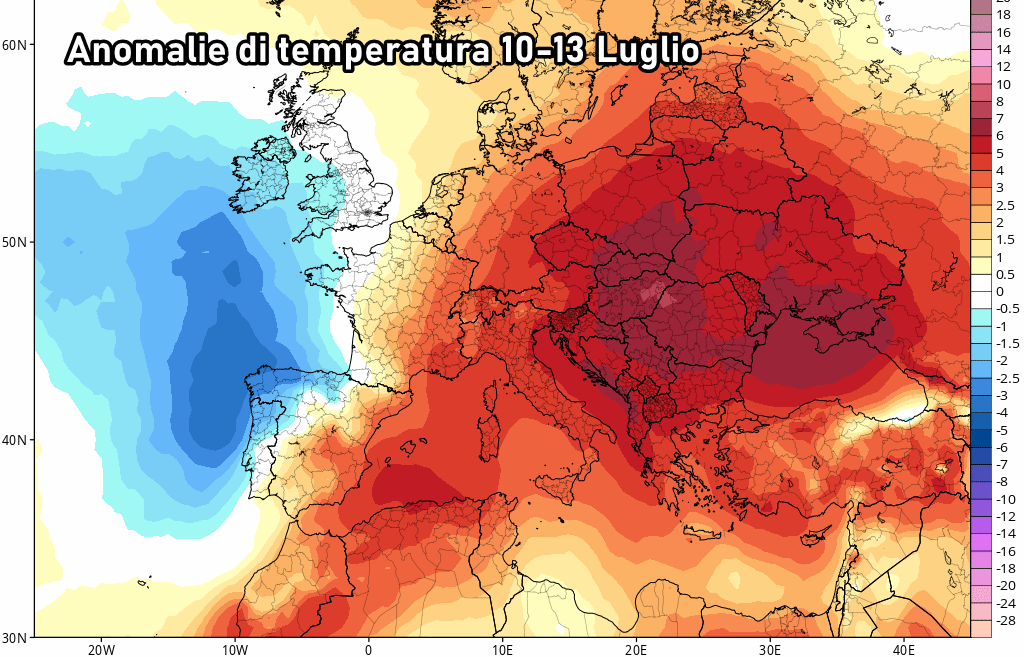 Eloquente è l’anomalia di temperatura prevista tra il 10 e il 13 luglio che mostra valori di almeno 4 o 5 ° superiori alle medie su quasi tutta la nostra penisola. Le anomalie più importanti le troviamo sull’Est Europa.