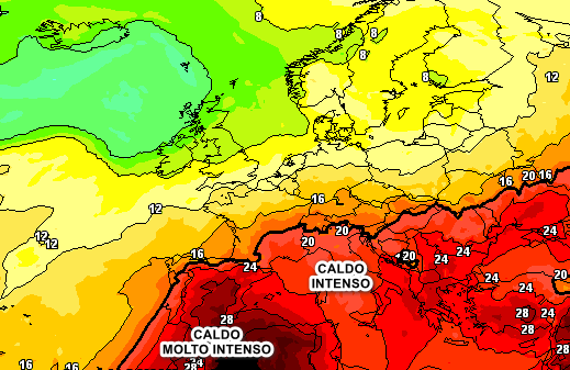 Dove vedete il colore più scuro sulla mappa, si prevedono isoterme a 1500 metri comprese tra 28 e 30°, valori fuori da ogni senso e logica anche se si trovano sul nord Africa. In Italia le isoterme alla medesima quota si prevedono tra + 20 e +25°, che testimoniano un’ondata di caldo intenso specie al centro e al sud.