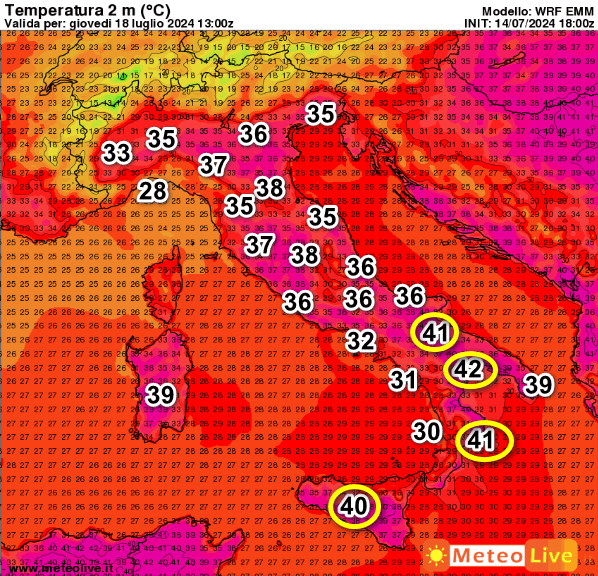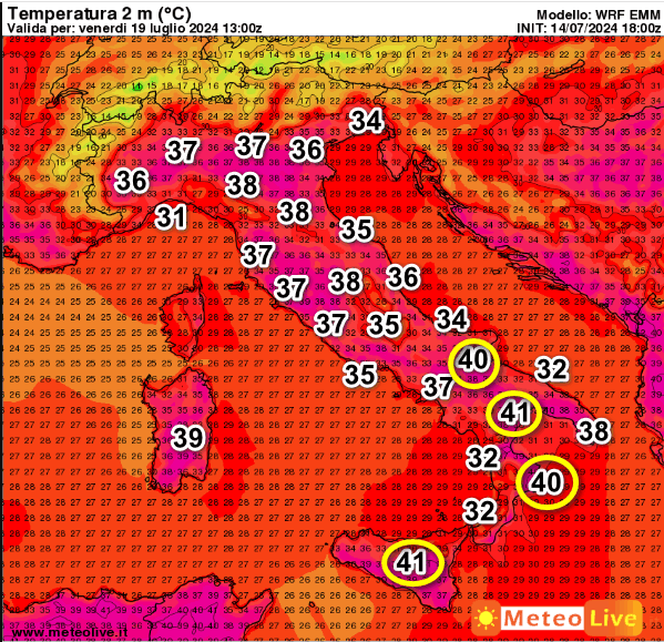 41° nelle zone interne della Sicilia e sulla Lucania, 40° sul Foggiano e sulla Calabria Ionica, ma osservate anche le temperature della Pianura Padana che si porteranno quasi ovunque oltre i 35°, con punte di 38-39° sulla Pianura Emiliana.